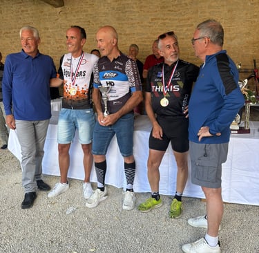 Notre coureur Hervé O. finit 28 sur 125 et monte sur la 3 ème marche du podium de sa catégorie d'âge (50-60 ans) récompense remise par Bernard Hinault parrain de la cyclo.