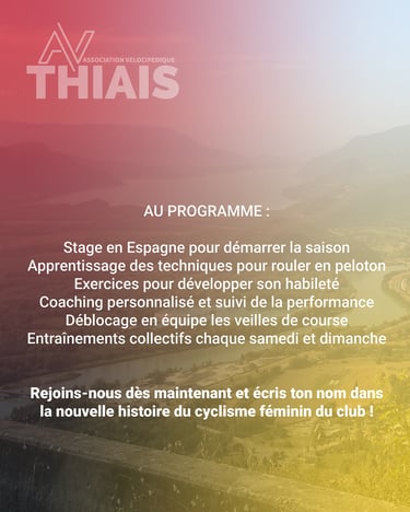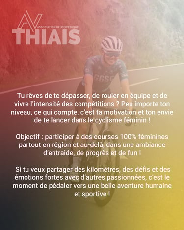 L'AV Thiais est un club à la fois dynamique et familial. Il est composé d'adhérents de tous âge, piqués par le virus du cyclisme. Des plus petits aux plus grands, nous avons à cœur de partager d'intenses moments de cyclisme.